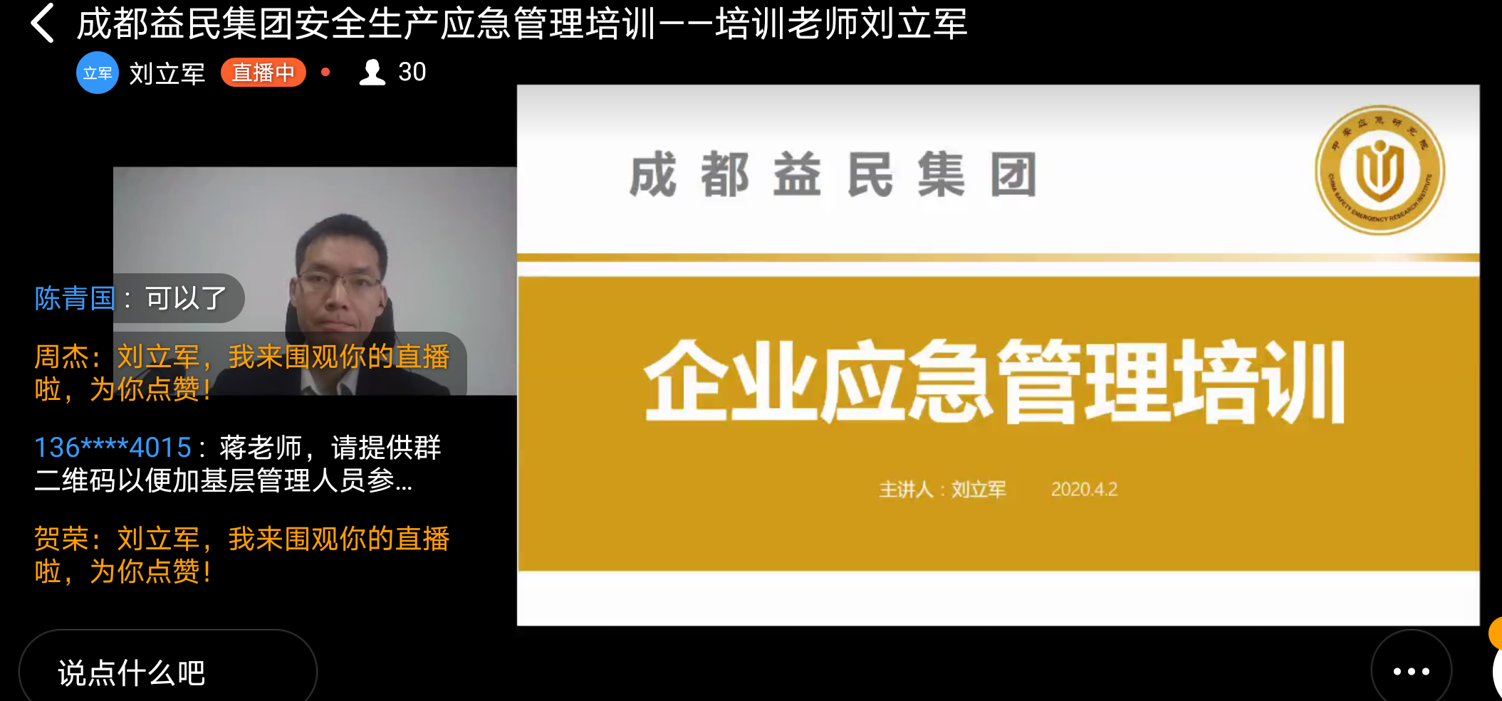 2020年4月2日,我院EHS专家刘立军老师受邀为成都益民集团及其下属单位开展了企业安全生产应急管理培训。本次培训采取线上培训模式,不用拘泥于场地,也避免了人员聚集。重点为益民集团讲授了应急管理的目的、应急预案的编制、应急预案的评审、应急预案的培训及演练等内容,通过培训后的效果评估及调查,该培训受到益民集团领导及一线岗位人员的广泛好评。